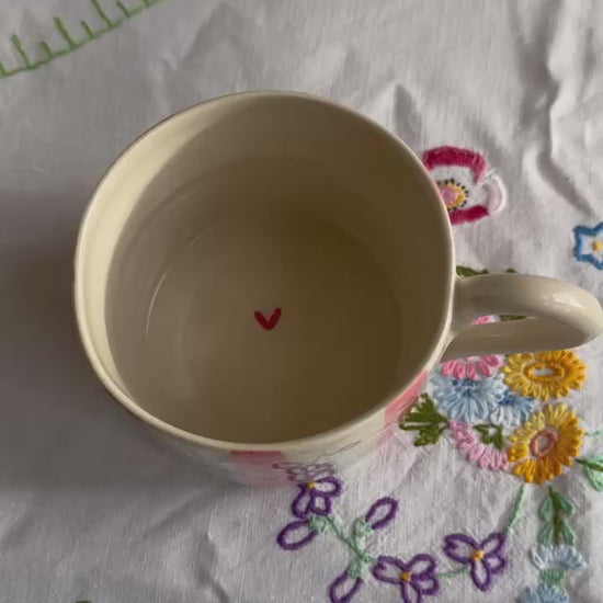 Beautifully handmade mugs with a touch of love. Pink stripes with hand painted red hearts. These are the perfect gift for your loved ones but also, for yourself. We all need some self-love and I really believe, the moment that you have that first sip of a cup or tea, or your morning coffee, there is hope and love in it.